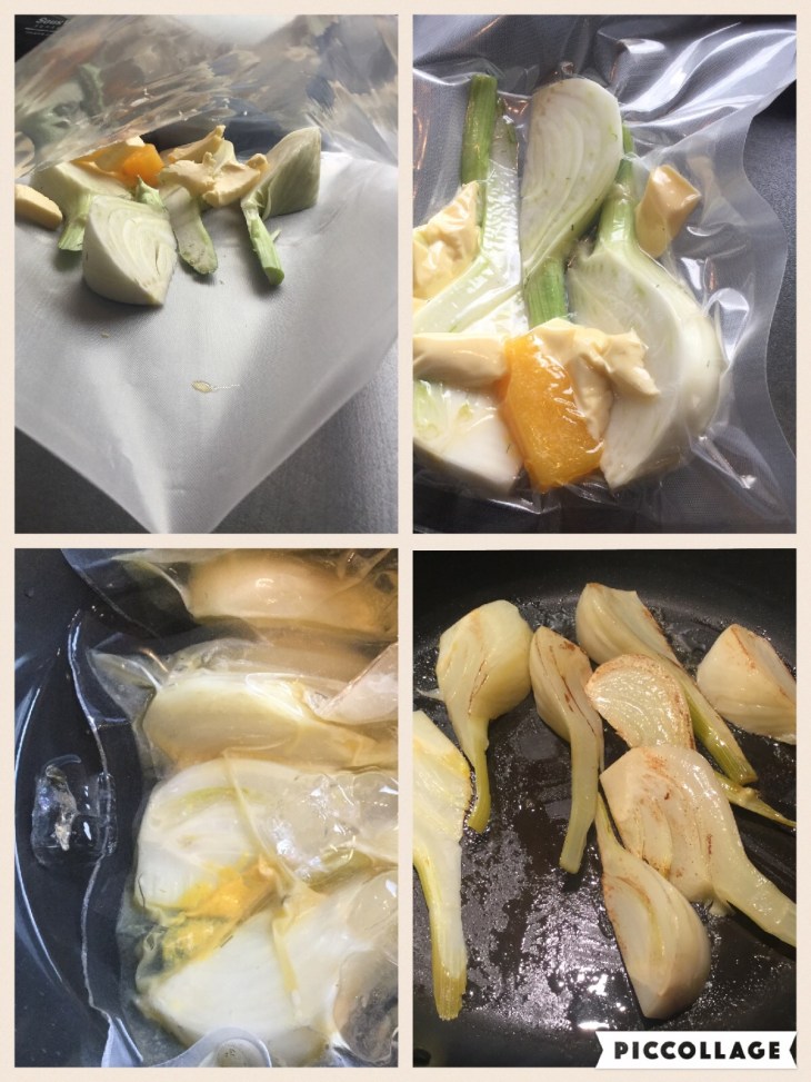 Til fennikel trenger du en stor fennikel, 2×20 g smør, 2xisbiter med appelsinjuice. Del fennikel i 8 båter. Ha i 2 sous vide poser sammen med resterende ingredienser. Vakumer og la posene kose seg i bassenget i 50 minutter på 85 grader. Når fennikelen er ferdig svømt har du posene direkte i isvann for så å oppbevare dem i kjøleskap frem til servering. Noen minutter før servering glaserer du fennikel i varm stekepanne sammen med væsken fra posene.