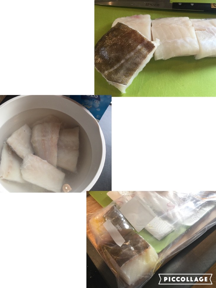 Så til hovedrolleinnehaveren! Skrei fileten deles i passende serveringsstykker som først får en 15-20 minutters omgang i saltlake. Laken skal ha såpass med salt at det minner om smaken av sjøvann. Løft skreien forsiktig ut og tørk med kjøkkenpapir. Ha maksimum to stykker i zip lock poser med 3-4 ss god olivenolje. Sviddå er stilt inn på 45 grader og venter utålmodig på å komme igang med fisketuren som varer i 50 minutter.