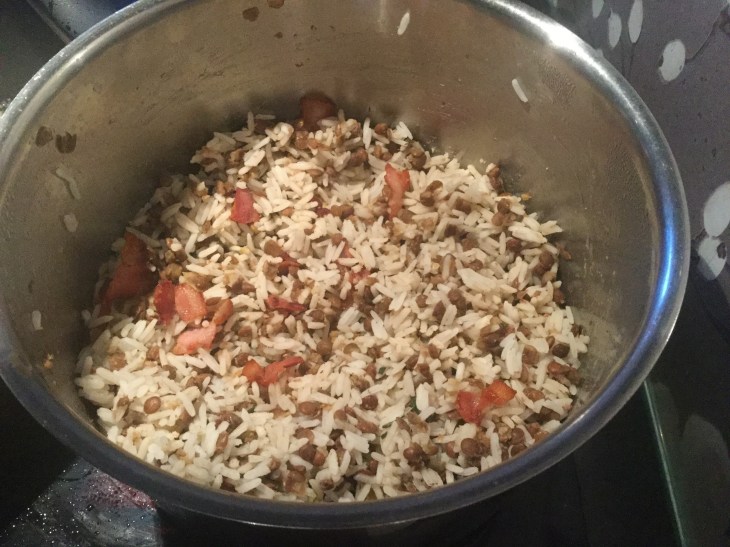Kok ris som anvist på den risen du måtte ha. Jeg gikk for en langkornet middagsris og kokte 4 porsjoner. Sprøstek bacon i en panne og la det renne av seg på kjøkkenpapir. Kok brune linser (rundt 200 gram) til de er møre. Med min trykkoker tok det ganske så nøyaktig 15 minutter på ring 2. Bland alt dette sammen i en gryte og ha i en ss finhakket rosmarin. Hold varm til servering.