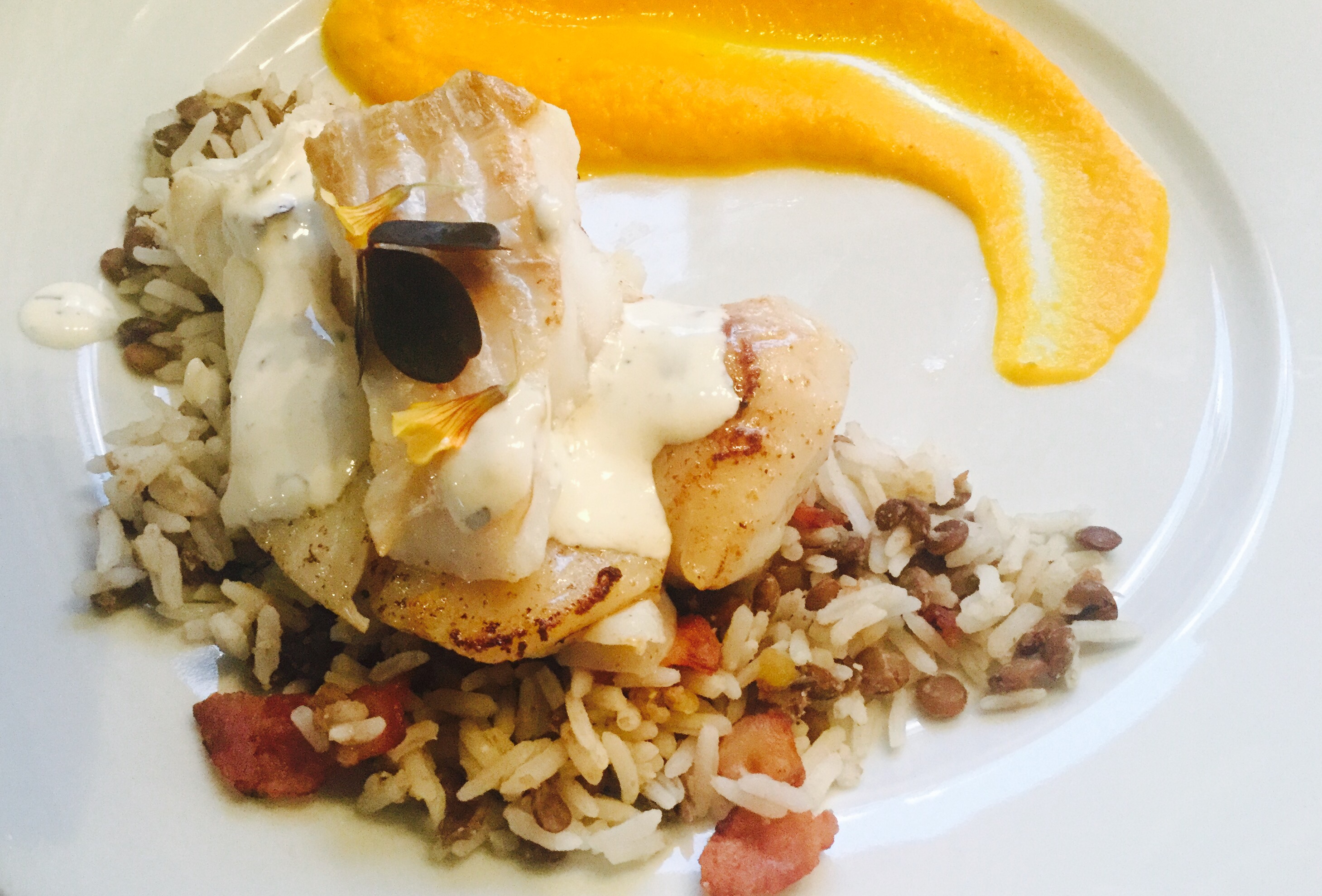 Denne retten får fram smilene og godlyden rundt bordet. Hørbare tegn på at dette er et måltid store og små setter stor pris på. Torsken er den store helten, tett fulgt av spennende konsistenser fra ris, linser, sprøstekt bacon og en fløyelsmyk gulrotpuré.
