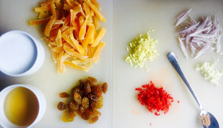 Syrlig, søtt og litt spicy var utgangspunktet for valg av følgende ingredienser: 190 g tørket mango skåret i strimler, 1 kopp sukker, 1/2 kopp eplesidereddik, 1 1/2 strimlet sjalottløk, ett fedd finhakket hvitløk, 1 1/2 cm finhakket ingefær, en liten neve gule rosiner, 1/2 ts sennepsfrø, 1 finhakket rød chili.