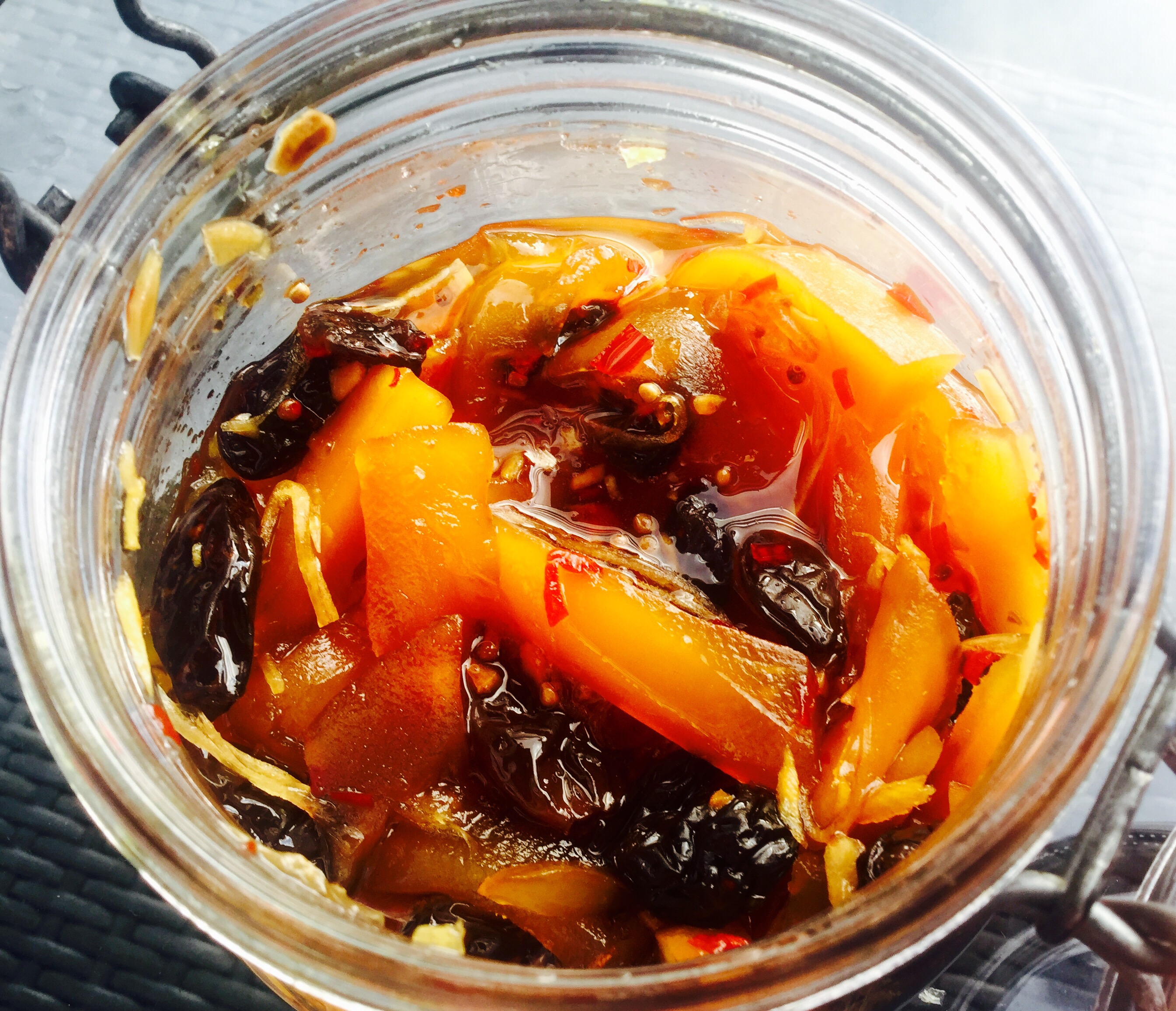Syrlig, søtt og litt spicy var utgangspunktet for valg av følgende ingredienser: 190 g tørket mango skåret i strimler, 1 kopp sukker, 1/2 kopp eplesidereddik, 1 1/2 strimlet sjalottløk, ett fedd finhakket hvitløk, 1 1/2 cm finhakket ingefær, en liten neve gule rosiner, 1/2 ts sennepsfrø, 1 finhakket rød chili.