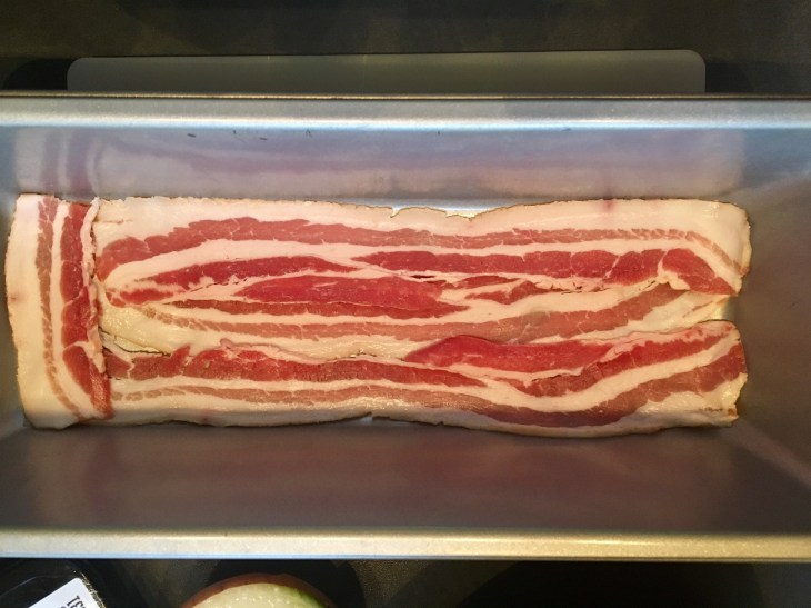 Rør inn resten av ingrediensene i deigen og hell oppi formen. Legg et par skiver bacon på toppen og la den kose seg i vannbad i ca 1 time og 15 minutter til konsistensen er fast.