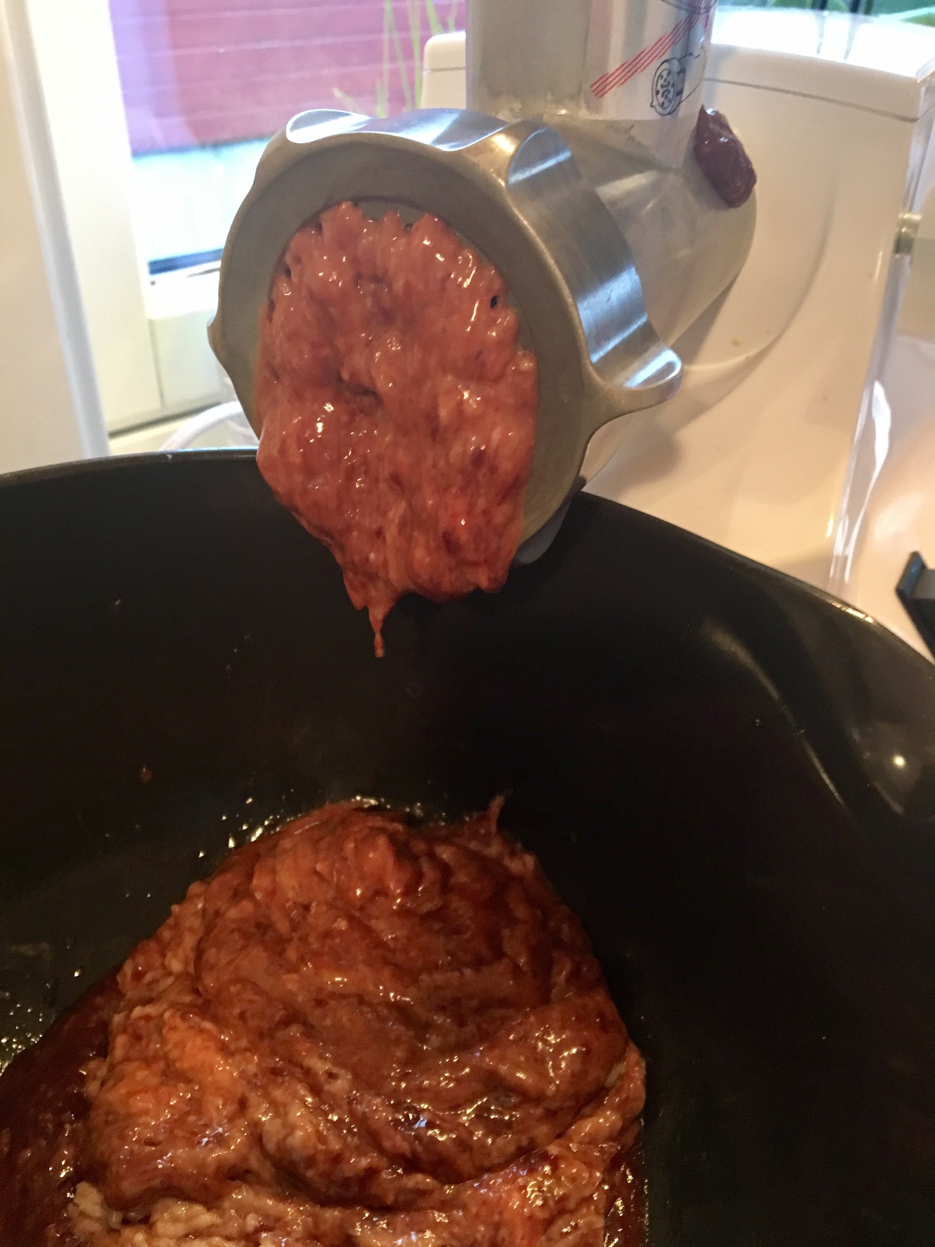 Del opp lever og sideflesk i mindre biter og kjør gjennom kverna 2 ganger. Moro!!