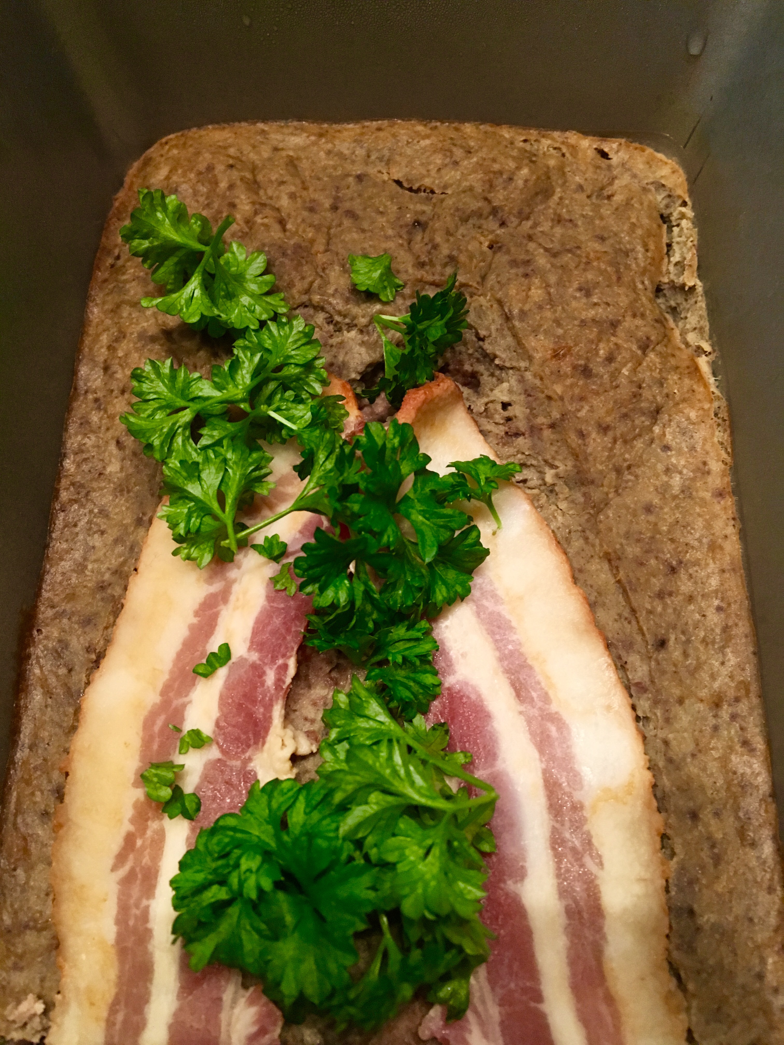 Rør inn resten av ingrediensene i deigen og hell oppi formen. Legg et par skiver bacon på toppen og la den kose seg i vannbad i ca 1 time og 15 minutter til konsistensen er fast.