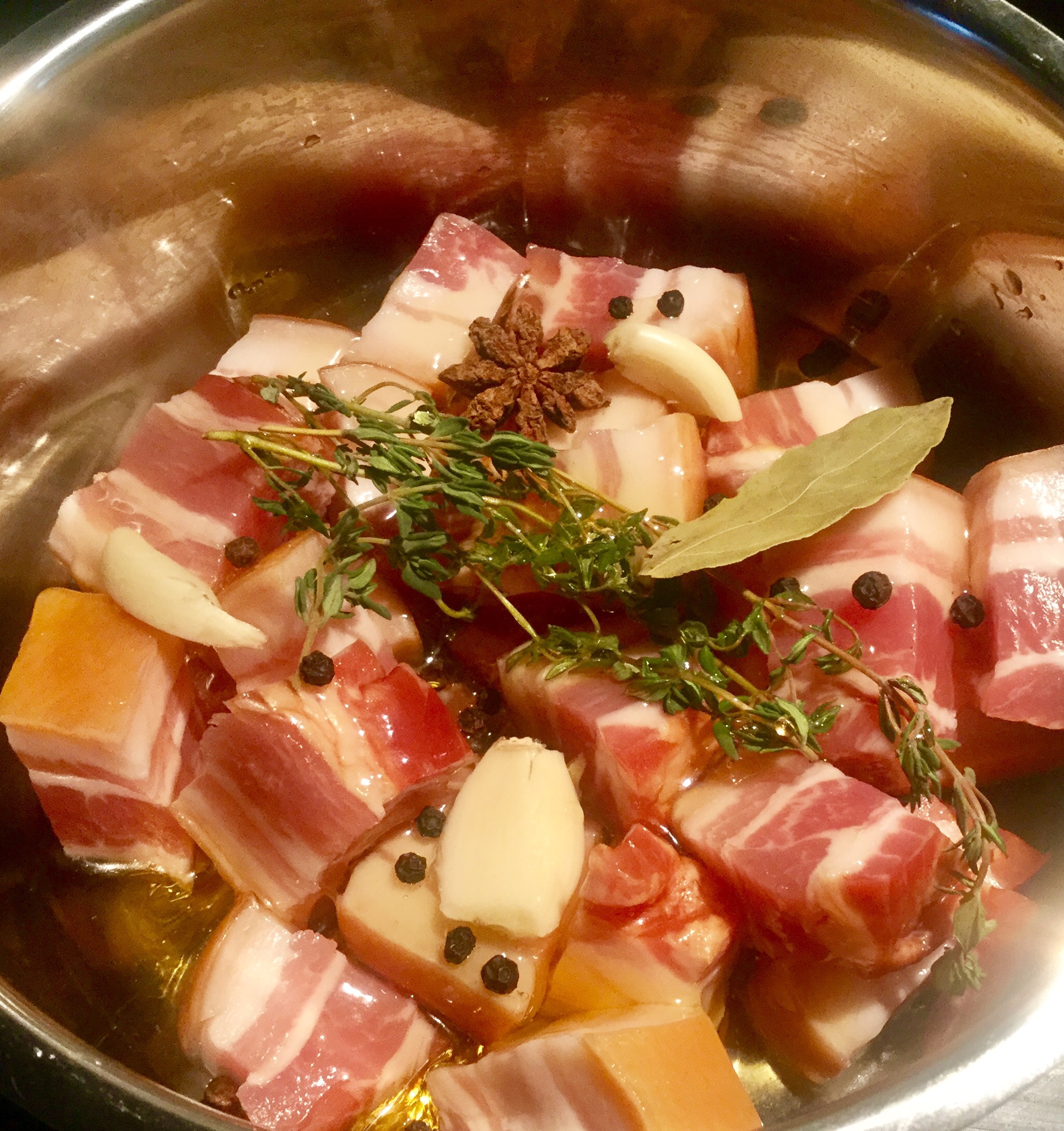 Wow faktoren i denne retten er utvilsomt sirupkokt bacon. Et tilbehør som kan brukes i mange forskjellige retter – kun fantasien setter begrensinger. Du trenger et stykke bacon på ca 200 g som du skjærer i biter på omtrent 1 cm. I tillegg finner du fram 1 dl lys sirup, noen hele pepperkorn, to-tre ss eddik (7%), en stjerneanis, ett fedd hvitløk, ett laurbærblad og et par kvister frisk timian.