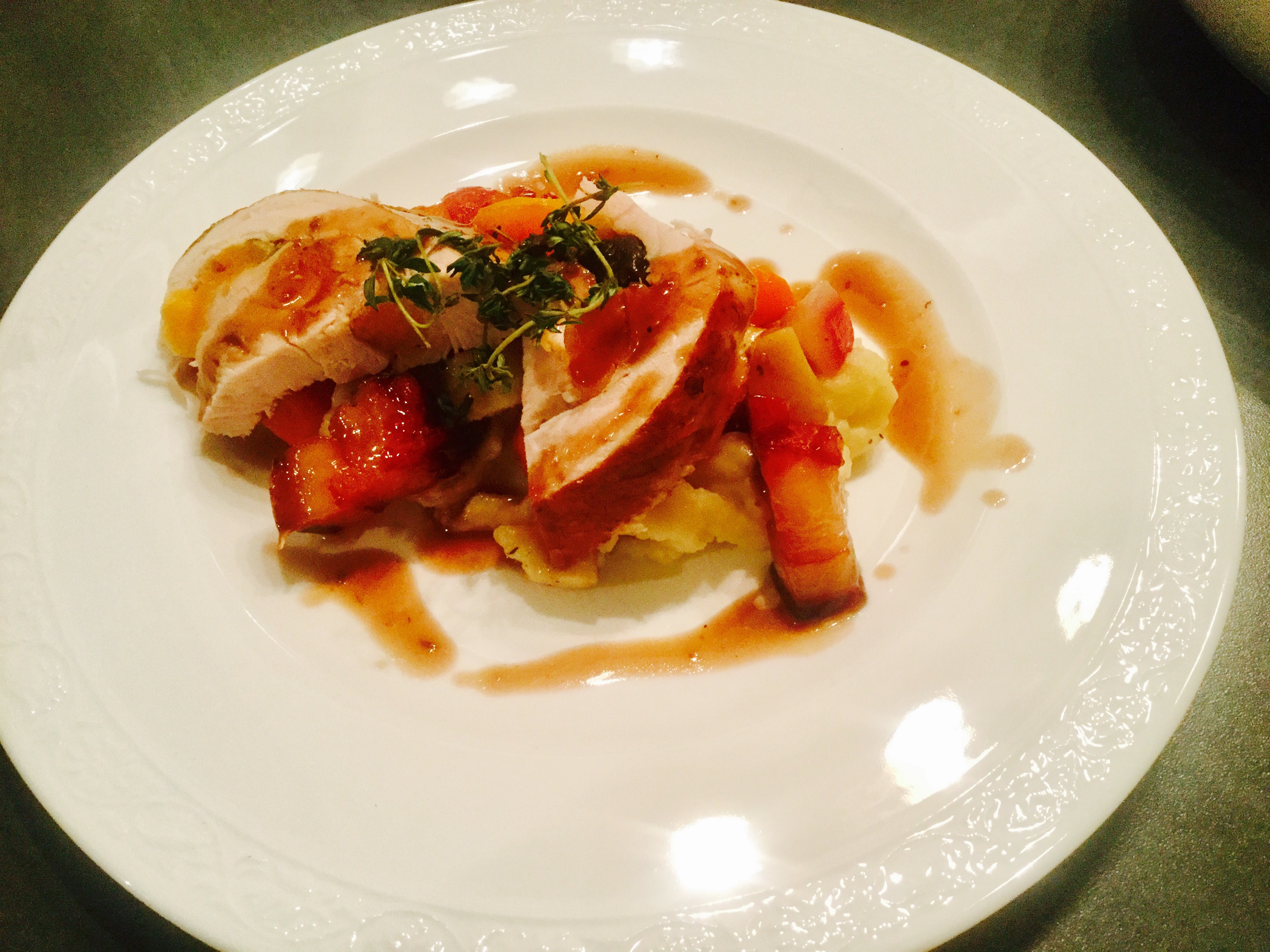 For å gjøre retten noe mer spennende ble den fylt med tørkede svisker og aprikos samt et par spiseskjeer kuttet gressløk. Fuglen ble servert med honningglaserte grønnsaker, potetmos, sirupskokt bacon og en fløyelsmyk saus som fremkalte primalskrik fra gjestene.