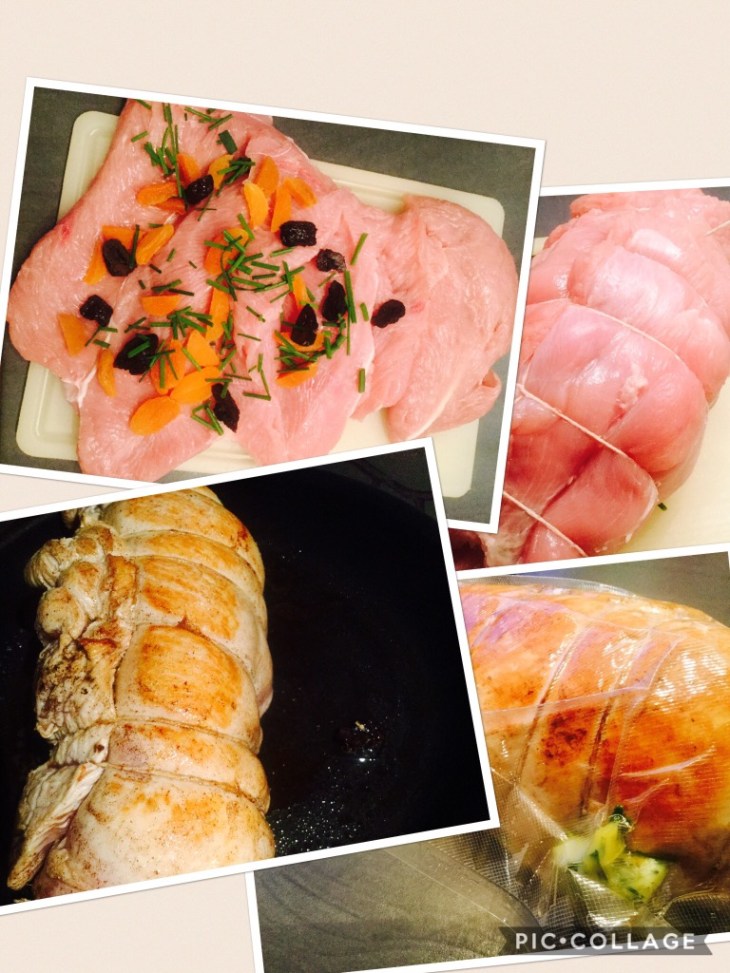 Varm opp bassenget til 61 grader og gå igang med klargjøringen av kalkunen. Til 8 personer trenger du et fyldig bryst på 2 kg, en neve tørkede aprikoser, svisker og noen strå med gressløk. Skjær opp kalkunfileten slik at den kan rulles og fordel frukt og løk. Rull sammen og bind opp fileten med tau. Fres i panne, ha i vakumpose sammen med smakstilsetning etter eget ønske. Jeg brukte frosne biter av olivenolje og timian. Slipp fuglen løs i bassenget og la den mørne seg gjennom heftig brystsvømming i 5 timer.