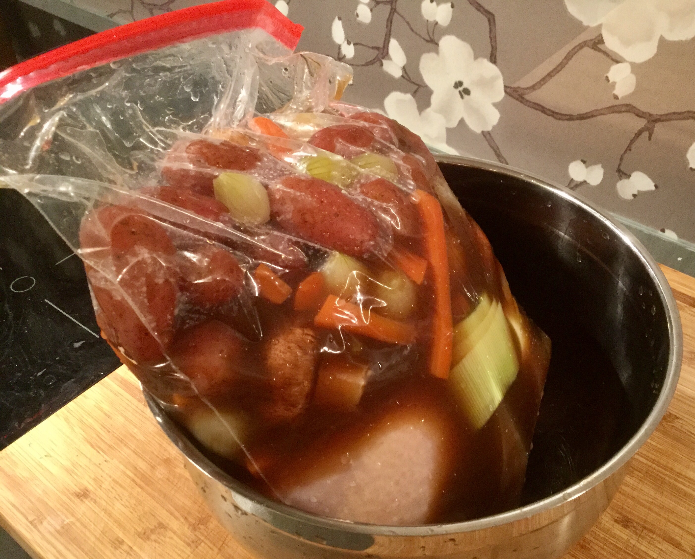 Sviddå tok imot posen med åpne armer, men hadde mildt sagt problemer med å holde den under vann! Derfor måtte jeg ty til en liten tallerken som vekt for å holde kyllingen under vannskorpen gjennom hele prosessen som tar 6 timer med nevnte 65 grader.