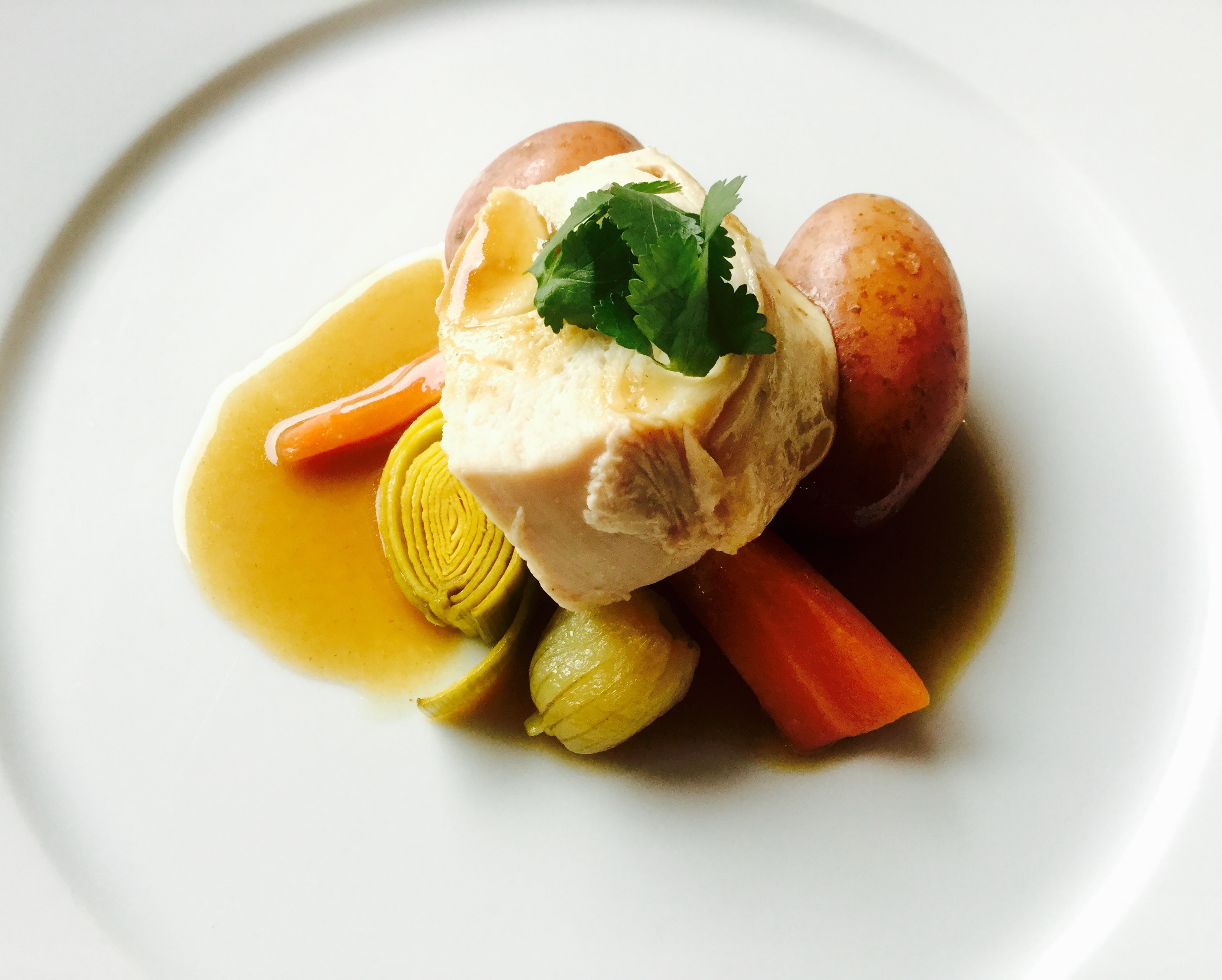 Jeg har vært noe skeptisk til å tilberede hel kylling i sous vide, men nå var tiden inne for å teste. Nøkkelen til suksess er riktig temperatur, svømmeturens lengde og at du får presset så mye luft som mulig ut av posen. Kyllingen posjeres i kyllingkraft sammen med garnityr….denne retten anbefales på det sterkeste!