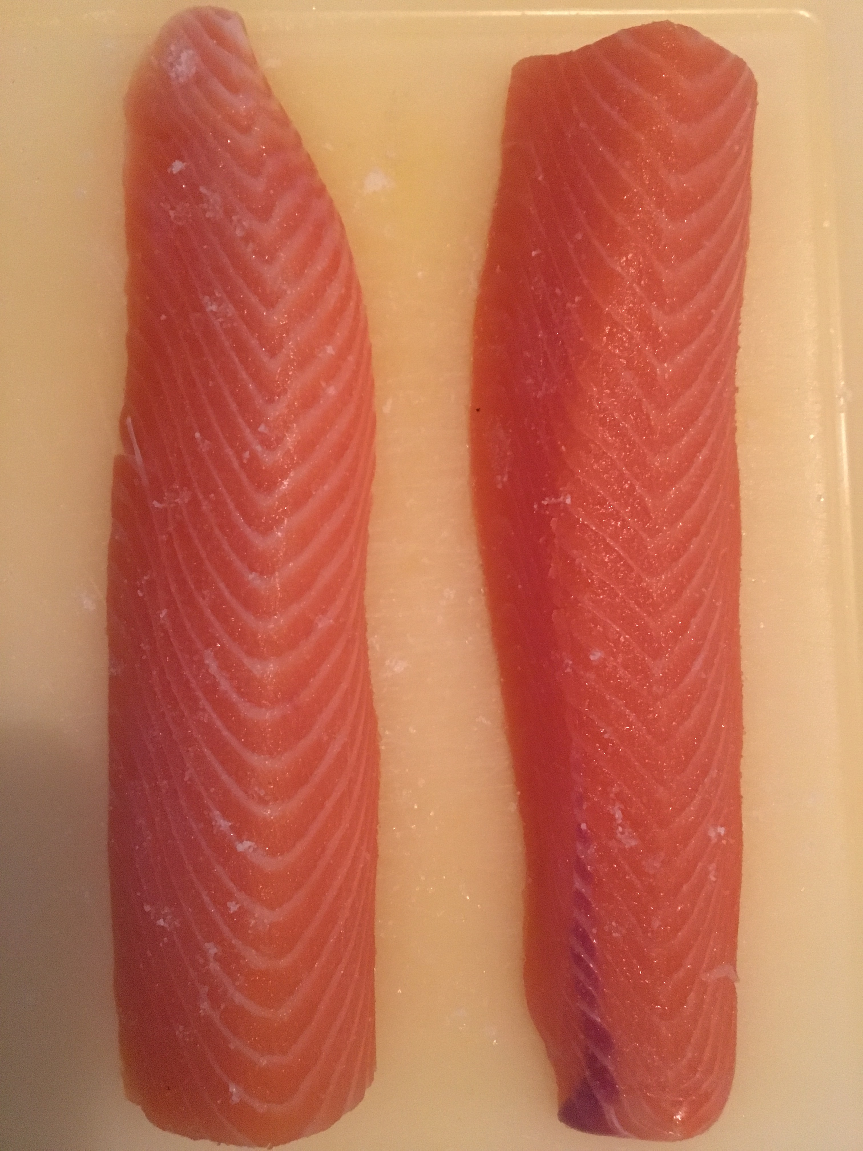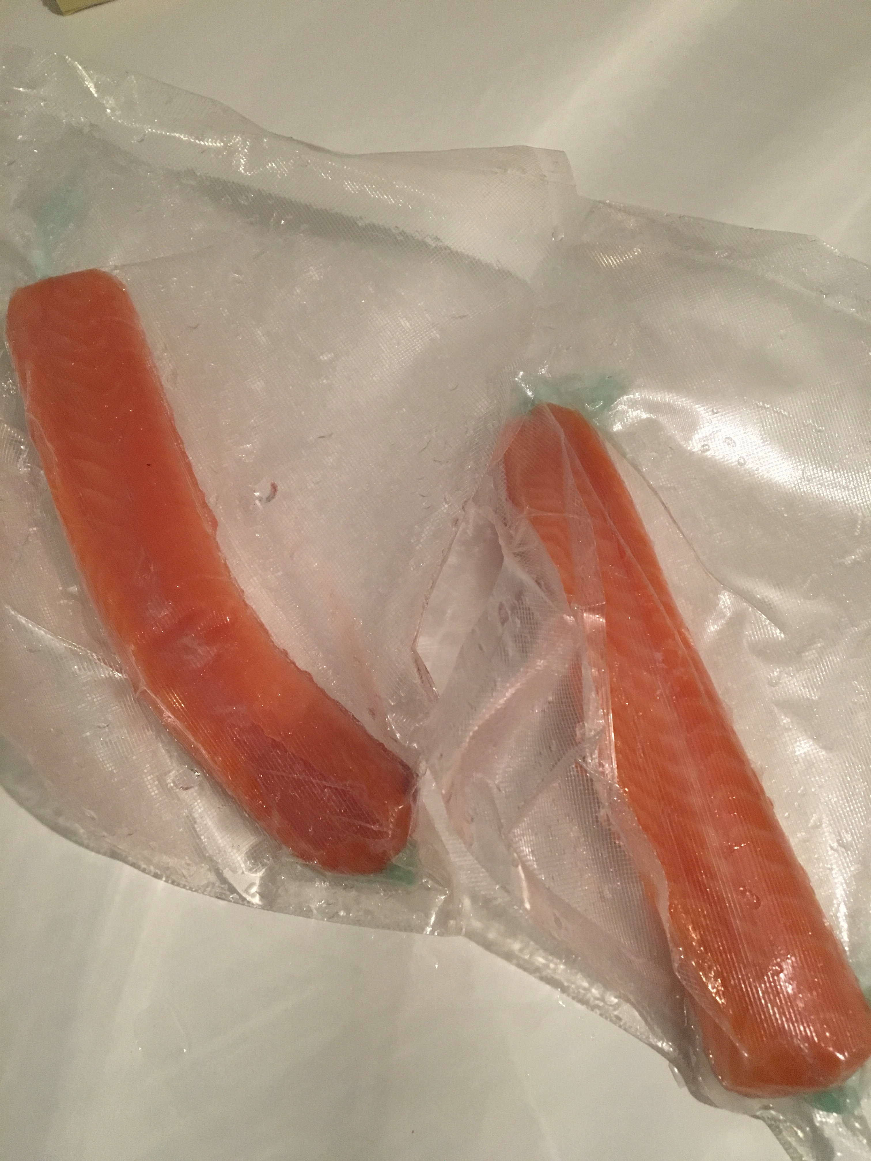 Til 4 personer trenger du ca 500 gram lakserygg – jeg fant et fint stykke levert av Salma. I tillegg må du finne fram 1 ts salt og 1 ts sukker. Del fileten i to like store deler og dryss over salt og sukker. La fisken hvile i 30 minutter. Deretter ruller du filetene stramt i plastfolie og vakumerer dem i hver sin pose. La fisken ta svalestup ut i bassenget, løft dem direkte fra vann til kjøleskap og la dem hvile der over natten.