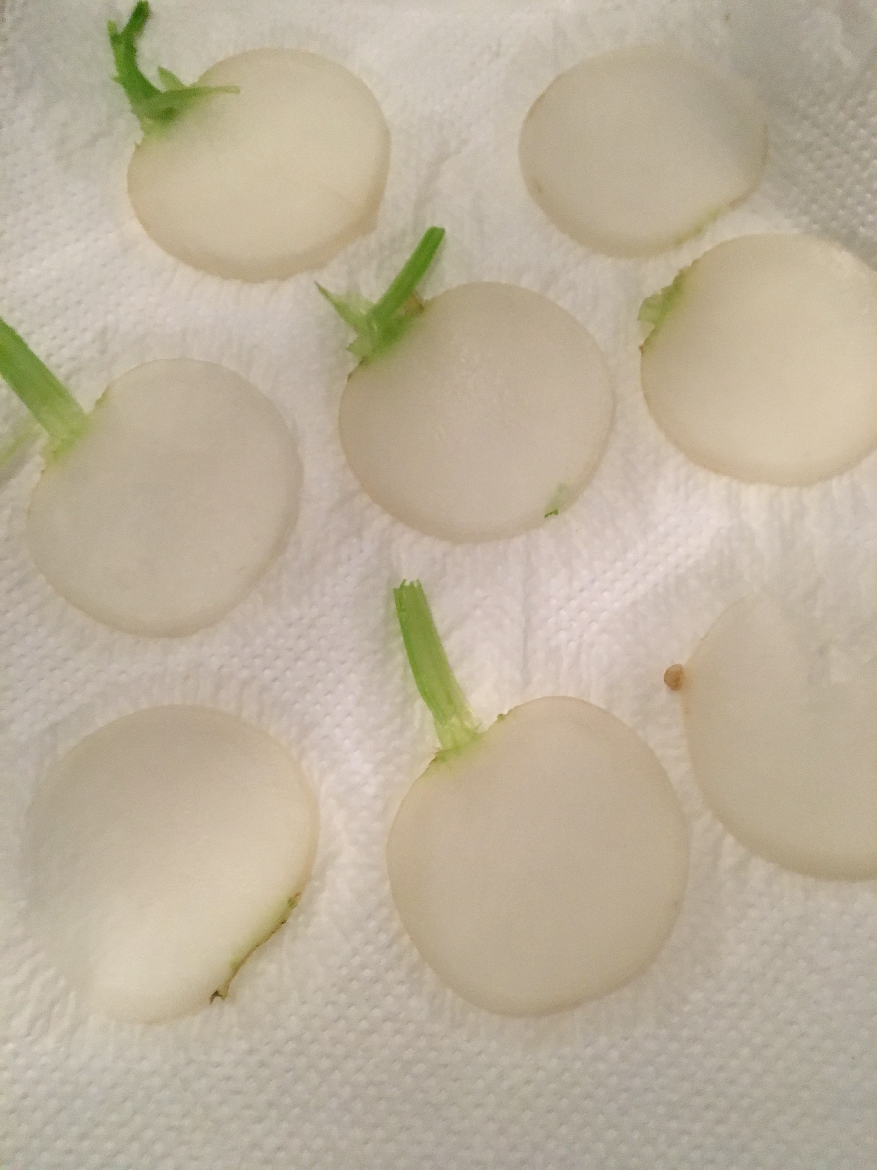 Blansjer fine skiver av nepe i lettsaltet, kokende vann i 1 minutt. Ta direkte over i isvann og la renne av seg på kjøkkenpapir.