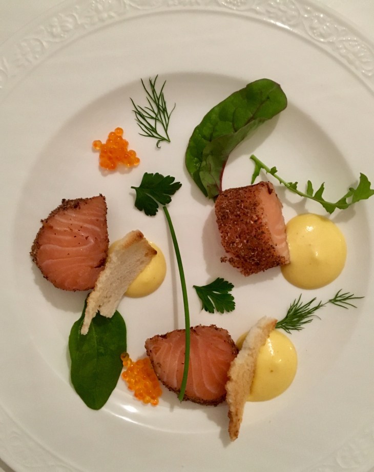 Si velkommen til Laksepastrami med eggeskremskum, ørretrogn og melbatoast.