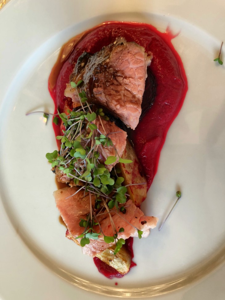Kalven fikk duve i bassenget i hele 28 timer på 54 grader og det ga meg oseaner av tid til å tenke ut hvilket selskap brystet skulle få på tallerkenen. Jeg landet til slutt på en fløyelsmyk rødbetpuré, ovnsbakte rødbeter og poteter, en rødvinsreduksjon og litt reddik china rose mikrogrønt for å gjøre smaksbildet komplett. Mikrogrønne vekster er smaksrike og proppfulle av næring…og det beste er at du får tak i det i velassorterte butikker.