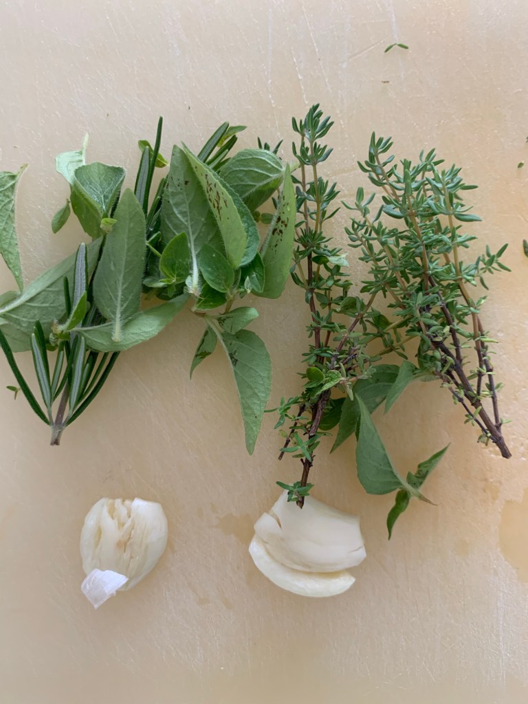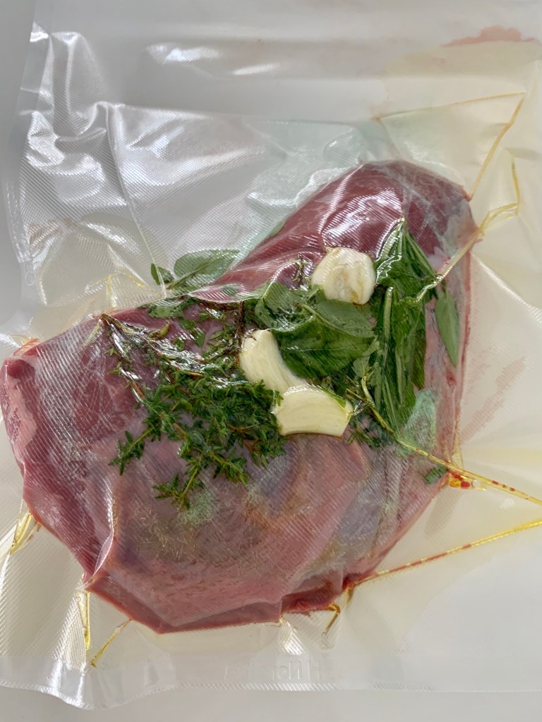 Tørk godt av kjøttet og legg i en vakumeringspose. Finn fram noen friske krydderkvaster – jeg hadde timian, oregano og estragon lett tilgjengelig i hagen. I tillegg skreller og presser du et par hvitløksbåter.
