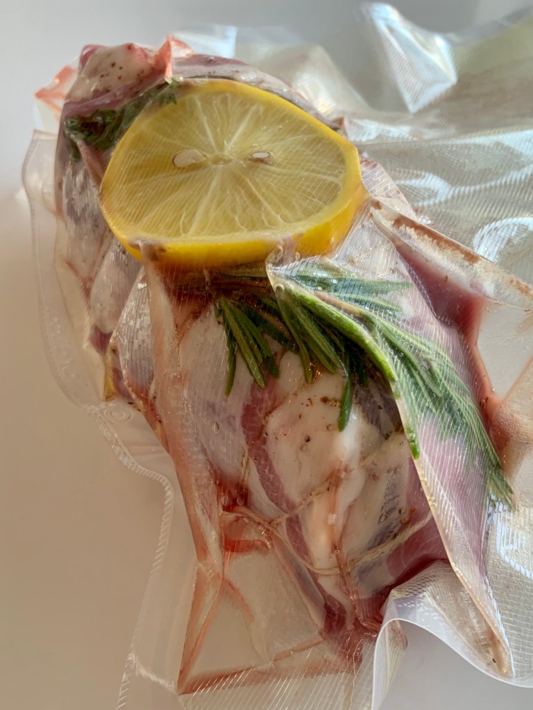 Krydre rullen med litt salt og pepper. Legg den i en vakumeringspose sammen med et par ss god olivenolje, litt frisk estragon og en skive sitron.