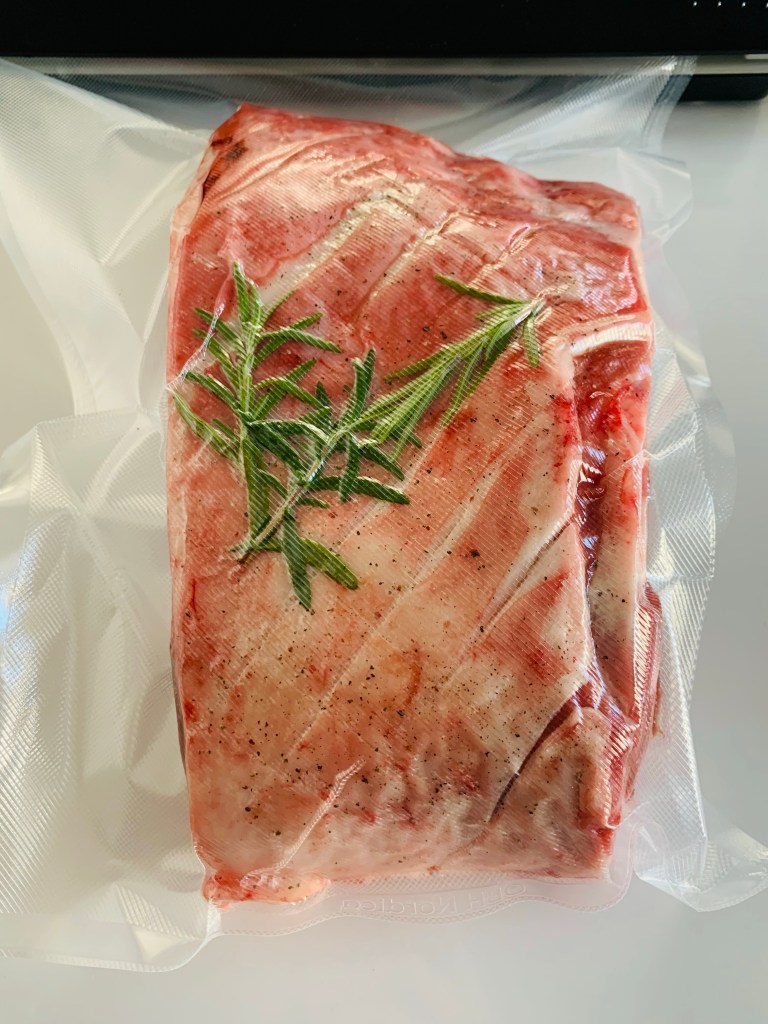 Det første du må gjøre er å forberede ribben til sin etterlengtede svømmetur. Snitt svoren og gni inn stykket med salt og grovkvernet pepper. Legg i pose sammen med et par stilker rosmarin, et par spiseskjeer olivenolje, vakumer og la herligheten ta en back-flip oppi bassenget.