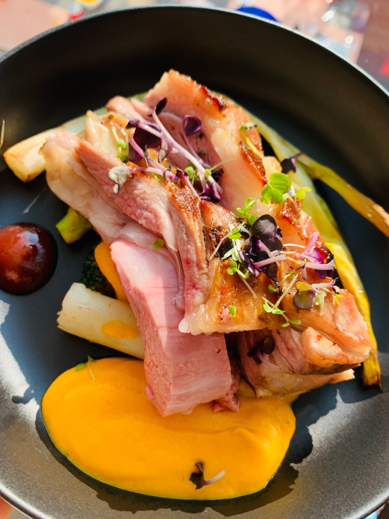 Da gjenstår det bare å legge opp herligheten. Pannestekte grønnsaker i bunn, noen skjeer med gulrotpuré og vårløk på siden. Server og ta i mot hyllesten:-)