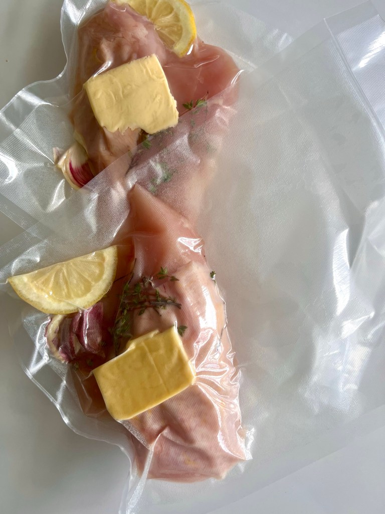 Gi kyllingbrystet mulighet til å svømme noen lengder i bassenget, så er du sikret et perfekt resultat! Vakuumer med en fedd hvitløk, litt frisk timian, en skive sitron og en klatt smør.